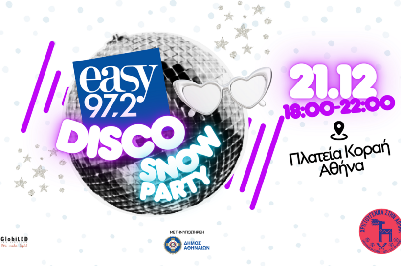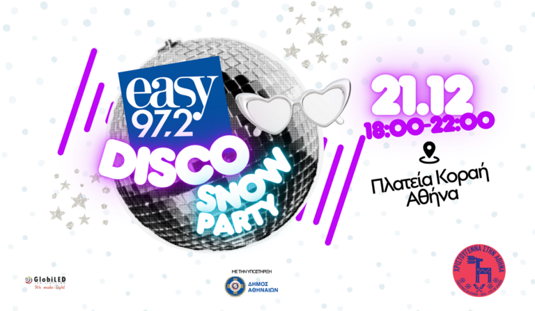 Easy 97.2 Disco Snow Party! Την Κυριακή 21 Δεκεμβρίου, τη μεγαλύτερη νύχτα του χρόνου, ο easy 97.2 φέρνει στην Πλατεία Κοραή, στο κέντρο της Αθήνας, ένα μοναδικό Disco Snow Party γεμάτο μουσική, εκπλήξεις και…χιόνι! Στο πλαίσιο των Χριστουγεννιάτικων εκδηλώσεων του Δήμου Αθηναίων, ο easy 97.2 μεταμορφώνει την Πλατεία Κοραή σε μια ανοιχτή disco σκηνή! Χιονονιφάδες, χριστουγεννιάτικη ατμόσφαιρα κι αγαπημένες επιτυχίες των 80’s, 90’s και 00’s θα κατακλύσουν τον χώρο δημιουργώντας την…