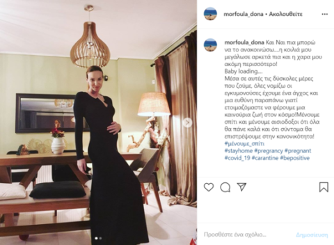 «Και Ναι πια μπορώ να το ανακοινώσω….η κοιλιά μου μεγάλωσε αρκετά πια και η χαρά μου ακόμη περισσότερο! Baby loading…. Μέσα σε αυτές τις δύσκολες μέρες που ζούμε, όλες νομίζω οι εγκυμονούσες έχουμε ένα άγχος και μια ευθύνη παραπάνω γιατί ετοιμαζόμαστε να φέρουμε μια καινούρια ζωή στον κόσμο!Μένουμε σπίτι και μένουμε αισιόδοξοι ότι όλα θα πάνε καλά και ότι σύντομα θα επιστρέψουμε στην κανονικότητα!», έγραψε στη λεζάντα της ανάρτησης της η Μορφούλα Ντώνα.