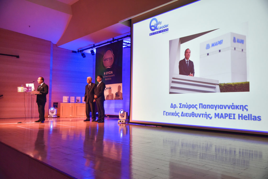 Στη φετινή εκδήλωση, ο Γενικός Διευθυντής της MAPEI Hellas, Δρ Σπύρος Παπαγιαννάκης τιμήθηκε με το βραβείο του «Έλληνα Quality Leader of the Year 2019». Η βράβευση είναι αποτέλεσμα του σπουδαίου έργου που έχει επιδείξει, κατορθώνοντας, μαζί με τους συνεργάτες του, να εφαρμόσει επιτυχώς αλλαγές και διαδικασίες ποιότητας που προωθούν συστηματικά την ανάπτυξη της κουλτούρας και της πρακτικής της Ποιότητας ως βασική ανταγωνιστική προϋπόθεση για την αποτελεσματική παρουσία της εταιρίας στην απαιτητική αγορά.