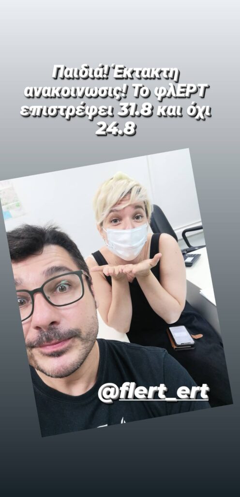 Η πρεμιέρα της εκπομπής «Φλερτ» που ήταν προγραμματισμένη για τη Δευτέρα 24 Αυγούστου τελικά μετατέθηκε για τις 31 του μήνα λόγω ενός κρούσματος κορονοϊού σε μέλος της ομάδας της εκπομπής.