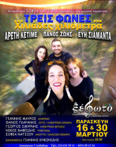 Μια μουσική παράσταση που ανταμώνει φωνές και ήχους χωρίς περιορισμούς και ταμπέλες! Από την Ανατολή ως τη Δύση, από την Ήπειρο ως την Τζαζ, από τα Βαλκάνια ως τη Λατινική Αμερική. Ένα παιχνιδιάρικο ταξίδι που ζωγραφίζει την ελευθερία της μουσικής αλλά και της ανθρώπινης ύπαρξης… Ένα ταξίδι που γλιστράει ανάμεσα στα σύνορα και μας θυμίζει ότι μαζί με τους λαούς ταξιδεύουν και οι πολιτισμοί τους! Η Αρετή Κετιμέ , η Εύη Σιαμαντά και ο Πάνος Ζώης σε μία παράσταση έκπληξη…Επί σκηνής και υπεύθυνη προγράμματος η συνθέτρια Σοφία Νάτσιου με την επταμελή μπάντα της. Σκηνοθετεί ο Γιάννης Κυφωνίδης!