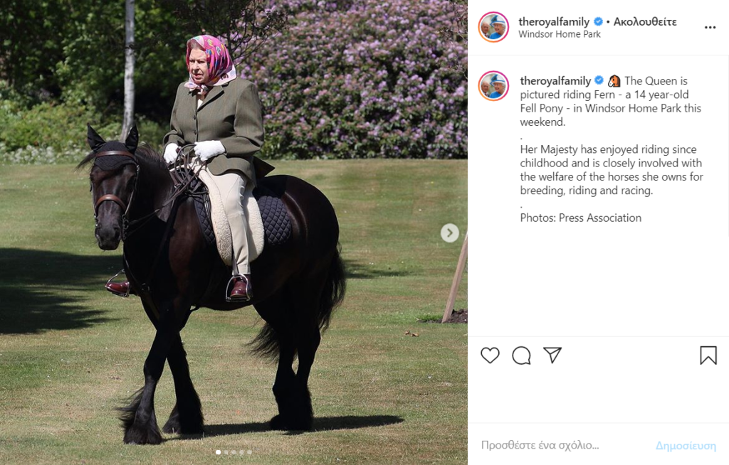 Όμως, όπως είδαμε μέσα από τον λογαριασμό της βασιλικής οικογένειας στο instagram, η βασίλισσα επέλεξε να απολαύσει την βόλτα της κάνοντας ιππασία.