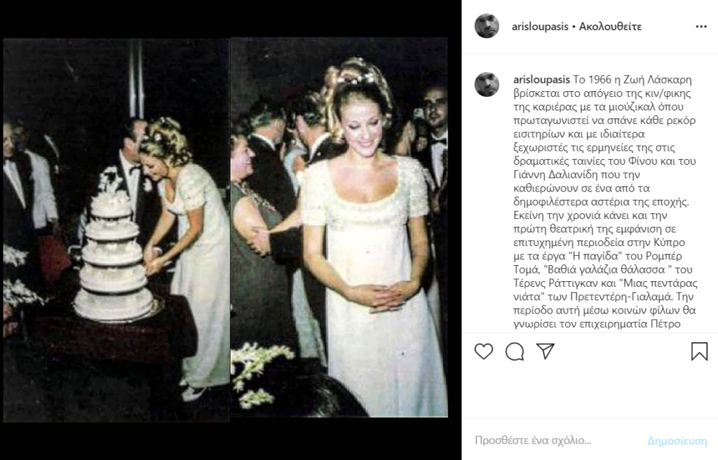Ο δημοσιογράφος και συλλέκτης Άρης Λουπάσης δημοσίευσε στον προσωπικό του λογαριασμό στο Ιnstagram μία φωτογραφία της Ζωής Λάσκαρη από τον πρώτο της γάμο με τον Πέτρο Κουτουμάνο το 1967.