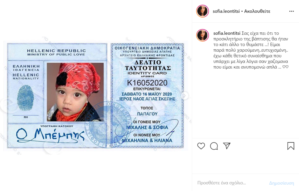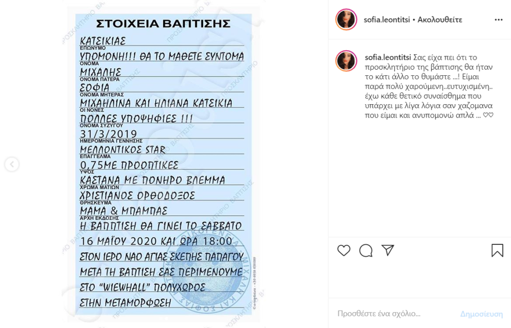 Ενώ μέσω ανάρτησης στον προσωπικό της λογαριασμό στο Instagram, η Σοφία θέλησε να μοιραστεί το πρωτότυπο προσκλητήριο της βάφτισης με τους διαδικτυακούς της φίλους.