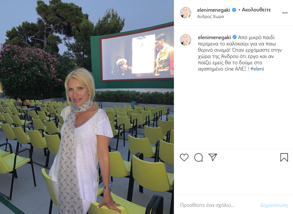 «Από μικρό παιδί περίμενα το καλοκαίρι για να πάω θερινό σινεμά! Όταν ερχόμαστε στην χώρα της Άνδρου ότι έργο και αν παίζει εμείς θα το δούμε στο αγαπημένο cine ΑΛΕΞ», έγραψε στη λεζάντα της ανάρτησης της η Ελένη Μενεγάκη.
