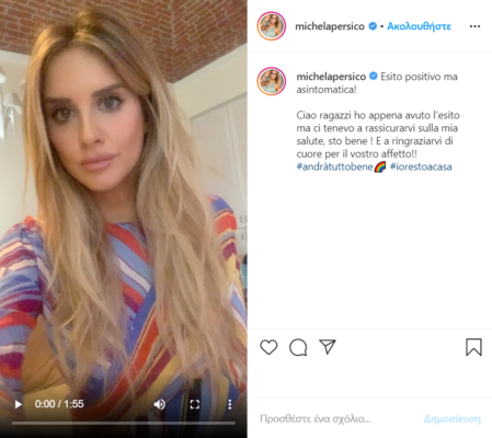 Μάλιστα, σε ανάρτηση που έκανε στον προσωπικό της λογαριασμό στο Instagram, έγραψε: «Το αποτέλεσμα είναι θετικό, αλλά είμαι χωρίς συμπτώματα. Γεια σας παιδιά, έχω το αποτέλεσμα, θέλω να σας σιγουρέψω για την υγεία μου, είμαι καλά και να σας ευχαριστήσω πάρα πολύ από καρδιάς για τη συμπαράσταση σας».