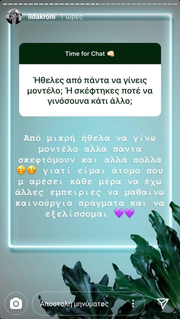 Μια από τις ερωτήσεις που δέχτηκε ήταν: “Ήθελες από πάντα να γίνεις μοντέλο; Ή σκέφτηκες ποτέ να γινόσουν κάτι άλλο;”