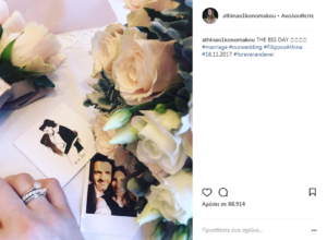 Την αποκάλυψη για το γάμο έκανε η ίδια η ηθοποιος μέσω μιας φωτογραφίας που ανάρτησε η Αθηνά στον προσωπικό της λογαριασμό στο Instagram. Συγκεκριμένα, φωτογράφησε τη βέρα και το μονόπετρο της, δίπλα σε μια ανθοδέσμη και φωτογραφίες με τους και στη λεζάντα έγραψε: “THE BIG DAY #marriage #FilipposAthina #18.11.2017 #foreverandever“.