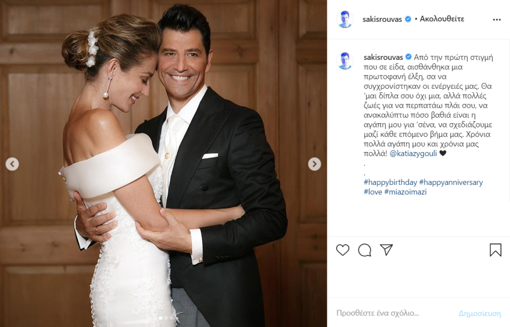 Έτσι με αφορμή την επέτειο γάμου αλλά και τα γενέθλια της Κάτιας Ζυγούλη, ο Σάκης Ρουβάς δημοσίευσε αρκετές φωτογραφίες στον προσωπικό του λογαριασμό στο Instagram και έκανε μια τρυφερή ερωτική εξομολόγηση.