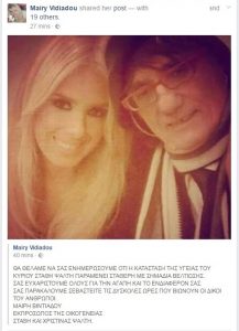 Μέσω του λογαριασμού της στο facebook, το απόγευμα της Πέμπτης, η εκπρόσωπος της οικογένειας του Στάθη Ψάλτη, Μαίρη Βιντιάδου, έκανε μια ανακοίνωση για την κατάσταση της υγείας του ηθοποιού, την οποία συνόδευσε με μία φωτογραφία που ήταν με τη σύζυγό του και έγραψε στη λεζάντα: