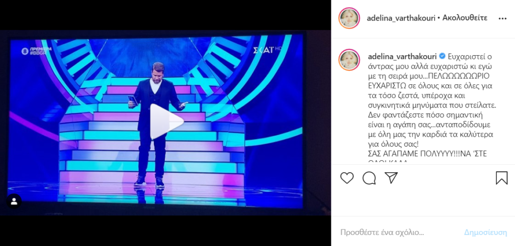 Λίγες ώρες μετά την πρεμιέρα, η Αντελίνα Βαρθακούρη θέλησε να ευχαριστήσει τους διαδικτυακούς της ακολούθους για όλα τα μηνύματα στήριξης που της έστειλαν.
