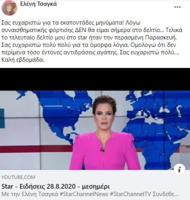 «Σας ευχαριστώ για τα εκατοντάδες μηνύματα! Λόγω συναισθηματικής φόρτισης ΔΕΝ θα είμαι σήμερα στο δελτίο… Τελικά το τελευταίο δελτίο μου στο star ήταν την περασμένη Παρασκευή. Σας ευχαριστώ πολύ πολύ για τα όμορφα λόγια. Ομολογώ ότι δεν περίμενα τόσο έντονες αντιδράσεις αγάπης. Σας ευχαριστώ πολύ…. Καλή εβδομάδα», έγραψε η Ελένη Τσαγκά.
