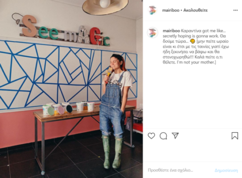 «Καραντίνα got me like… secretly hoping is gonna work. Θα δούμε τώρα… [μην πείτε ωραίο είναι κι έτσι με τις ταινίες γιατί έχω ήδη ξεκινήσει να βάφω και θα στενοχωρηθώ!!! Καλά πείτε ο,τι θέλετε. I’m not your mother]», έγραψε στη λεζάντα της ανάρτησης της.