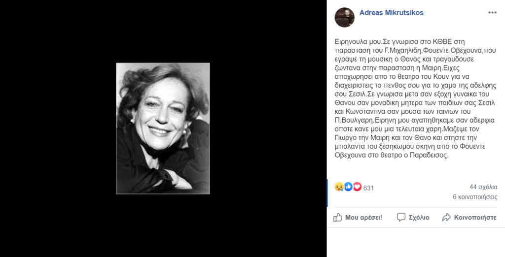 Σε γνώρισα μετά σαν έξοχη γυναίκα του Θάνου σαν μοναδική μητέρα των παιδιών σας Σεσιλ και Κωνσταντίνα σαν μούσα των ταινιών του Π.Βουλγαρη. Ειρήνη μου αγαπηθήκαμε σαν αδέρφια οπότε κάνε μου μια τελευταία χάρη. Μάζεψε τον Γιώργο την Μαίρη και τον Θάνο και στήστε την μπαλάντα του ξεσηκωμου σκηνή από το Φουεντε Οβεχουνα στο θέατρο ο Παράδεισος», έγραψε ο Ανδρέας Μικρούτσικος.