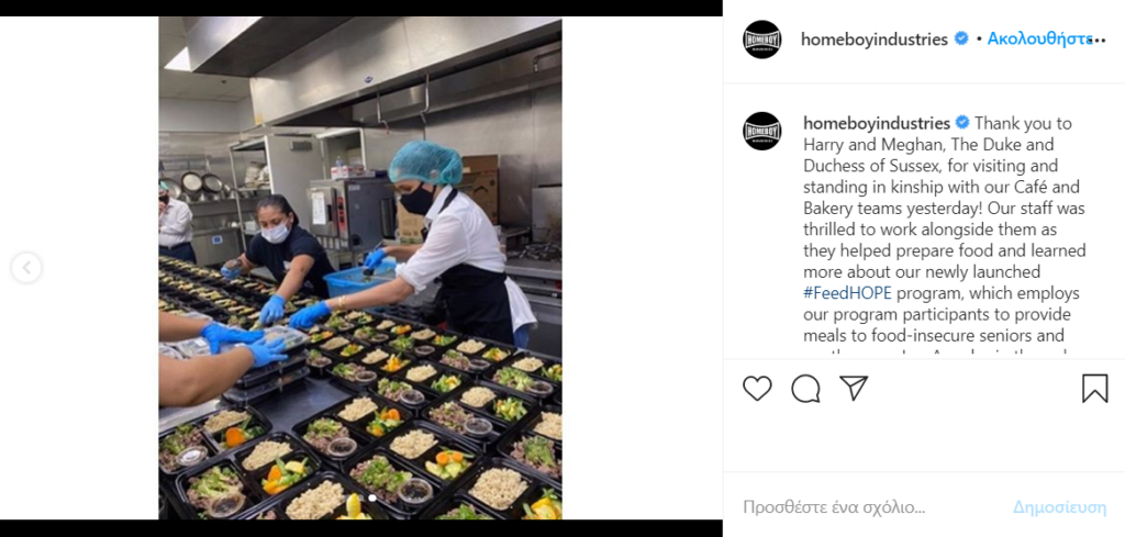 Η Homeboy Industries ανέβασε τις φωτογραφίες στο Ιnstagram και ευχαρίστησε δημόσια τον Harry και την Meghan για την πολύτιμη βοήθειά τους, η οποία έκανε τους εργαζόμενους της επιχείρησης να ενθουσιαστούν.