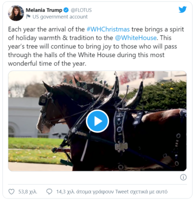 «Ναι, αλλά τι συμβαίνει με τα παιδιά που χωρίστηκαν από τους γονείς τους;. Αφήστε με ήσυχη. Γιατί δεν είπαν τίποτα όταν ήταν οι Ομπάμα;». Αλλά χθες, η Μελάνια Τραμπ ήταν όλο χαμόγελα καθώς καλωσόρισε το δέντρο και πόζαρε για φωτογραφίες με τους ιδιοκτήτες της φάρμας από όπου προήλθε.