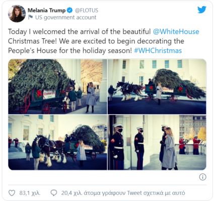 Το γραφείο της Πρώτης Κυρίας σύντομα θα αποκαλύψει το θέμα της φετινής χριστουγεννιάτικης διακόσμησης του Λευκού Οίκου – πέρυσι ήταν στα λευκά- που θα είναι η τελευταία σημαντική πράξη της Μελάνια Τραμπ ως Πρώτη Κυρία.