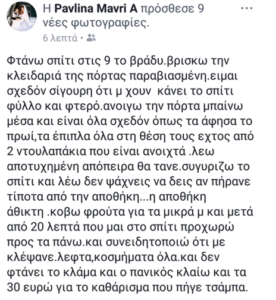«Φτάνω σπίτι στις 9 το βράδυ. Βρίσκω την κλειδαριά της πόρτας παραβιασμένη. Είμαι σχεδόν σίγουρη ότι μου έχουν κάνει το σπίτι φύλλο και φτερό. Ανοίγω την πόρτα, μπαίνω μέσα και είναι όλα σχεδόν όπως τα άφησα το πρωί, τα έπιπλα όλα στη θέση τους, εκτός από δύο ντουλαπάκια που είναι ανοιχτά, Λέω αποτυχημένη απόπειρα θα ‘ταν», έγραψε η Παυλίνα Μαυρή, που υποδύθηκε την Δήμητρα στην επιτυχημένη σειρά του ΑΝΤ1.