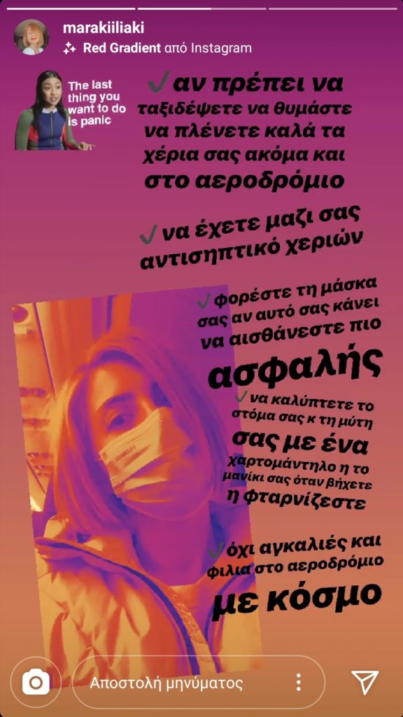 Η ίδια θέλησε αυτή τη φορά μέσα από τον προσωπικό της λογαριασμό στο Instagram, να ενημερώσει τους διαδικτυακούς της φίλους για τους κανόνες υγιεινής στα αεροδρόμια, σχετικά με τον κορονοϊό.