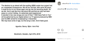 Το θρυλικό συγκρότημα από τη Σουηδία, «Αποτέλεσμα ήταν δύο νέα τραγούδια, το ένα από τα οποία ‘I Still Have Fair In You’ θα παρουσιαστεί από τους ψηφιακούς εαυτούς μας σε ένα ειδικό πρόγραμμα παραγωγής NBC και BBC, που θα μεταδοθεί τον Δεκέμβριο. Μπορεί να γεράσαμε, αλλά το τραγούδι είναι νέο. Και μας κάνει να αισθανόμαστε όμορφα. Αγκνεθα, Μπενι, Μπγιορν Αννι-Φριντ – Στοκχόλμη, Σουηδία, 27 Απριλίου 2018».