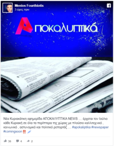 «Νέα Κυριακάτικη εφημερίδα ΑΠΟΚΑΛΥΠΤΙΚΑ NEWS …. έρχεται τον Ιούλιο κάθε Κυριακή σε όλα τα περίπτερα της χώρας με πλούσιο καλλιτεχνικό , κοινωνικό , αστυνομικό και πολιτικό ρεπορτάζ …. #apokaliptika #newspaper #comingsoon».