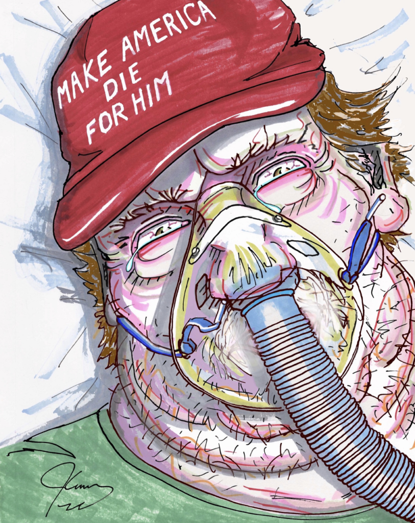«176.000 θάνατοι και συνεχίζουμε να μετράμε», έγραψε στην λεζάντα πάνω από το τελευταίο του έργο, που απεικονίζει τον Αμερικανό πρόεδρο με αναπνευστήρα, βαριά άρρωστο, πάνω στα λευκά σεντόνια μιας νοσοκομειακής κλίνης. Από την στιγμή που ανάρτησε τον πίνακα με την τελευταία καταμέτρηση νεκρών, ο απολογισμός στις ΗΠΑ αυξήθηκε στις 177.346 νεκρών μέσα σε λίγες ώρες.