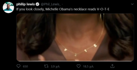 Για να τονίσει πόσο σημαντικό είναι ο κόσμος να παρευρεθεί στις κάλπες φόρεσε ένα χρυσό κολιέ το οποίο έγραφε την λέξη “VOTE“. Όπως αναφέρει η κριτικός μόδας των New York Times, Vanessa Friedman το κολιέ αυτό δημιουργήθηκε το 2012 από την Αφροαμερικανίδα σχεδιάστρια Chari Cuthbert και κοστίζει περίπου 315 δολάρια.
