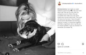 Πιο συγκεκριμένα, την Τρίτη πέθανε η αγαπημένη σκυλίτσα της, Gabbana. Η τηλεπερσόνα ανήρτησε μία σειρά τρυφερών φωτογραφιών στον λογαριασμό της στο Instagram με το αγαπημένο της μαύρο τετράποδο.