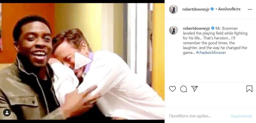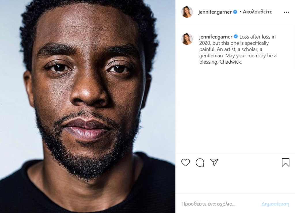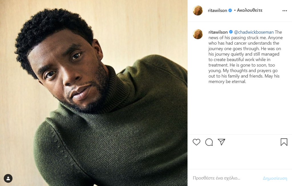 «Η πραγματική δύναμη του Τσάντγουικ Μπόουζμαν ήταν μεγαλύτερη απ’ ό,τι είδαμε στην οθόνη. Από τον “Black Panther” έως τον “Τζάκι Ρόμπινσον” ενέπνευσε γενιές και τους έδειξε ότι μπορούν να είναι οτιδήποτε θέλουν – ακόμα και σούπερ ήρωες. Η Τζιλ και εγώ προσευχόμαστε για τους αγαπημένους του σε αυτή τη δύσκολη στιγμή».