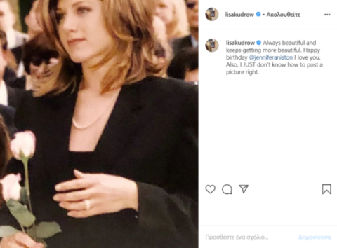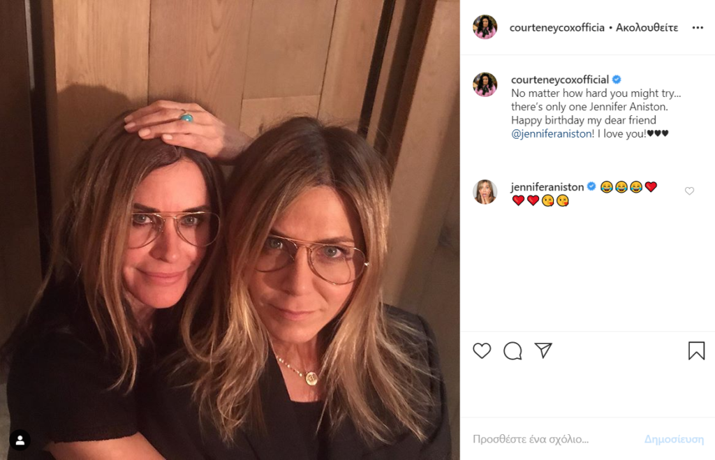 Με αφορμή τα 51α γενέθλια της ελληνικής καταγωγής Jennifer Aniston, η Courteney Cox, η Lisa Kudrow και ο Matthew Perry έστειλαν ένα μήνυμα και μέσω των social media στην «κολλητή» τους, γράφοντας πως «δεν έχει σημασία πόσο σκληρά μπορεί να προσπαθείς… υπάρχει μόνο μία Τζένιφερ Άνιστον. Ευτυχισμένα γενέθλια αγαπημένη μου φίλη. Τζένιφερ Άνιστον σε αγαπώ», με πολλές καρδούλες συνοδεία.