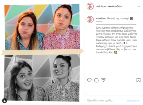 “Me and my monkey! μου έγραψε κάποιος σήμερα στο YouTube που ανεβάσαμε μαζί βίντεο με το Αλικάκι, ότι όταν είμαι μαζί της «γελάω αλλιώς» και είχε τόσο δίκιο! Είμαι αλλιώς όταν είμαστε μαζί. Είμαι ολόκληρη εγώ, γι αυτό… Καληνύχτα πίπολ μου!” , έγραψε η Μαίρη στη λεζάντα της φωτογραφίας που ανήρτησε.