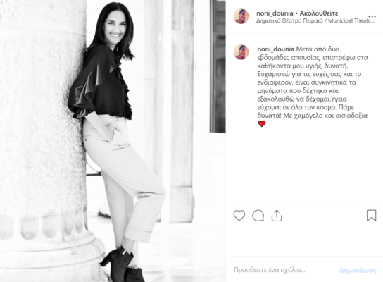 «Μετά από δύο εβδομάδες απουσίας, επιστρέφω στα καθήκοντα μου υγιής, δυνατή. Ευχαριστώ για τις ευχές σας και το ενδιαφέρον, είναι συγκινητικά τα μηνύματα που δέχτηκα και εξακολουθώ να δέχομαι. Υγεία εύχομαι σε όλο τον κόσμο. Πάμε δυνατά! Με χαμόγελο και αισιοδοξία» ήταν η λεζάντα που επέλεξε να βάλει στη μία φωτογραφία έξω από το Δημοτικό Θέατρο Πειραιά.