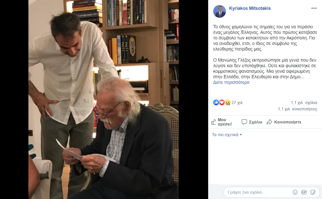 Ανάμεσά τους και ο Πρωθυπουργός, Κυριάκος Μητσοτάκης ο οποίος δημοσίευσε στο facebook μια κοινή τους φωτογραφία και με ένα μακροσκελές κείμενο είπε το δικό του «αντίο» στον Μανώλη Γλέζο.