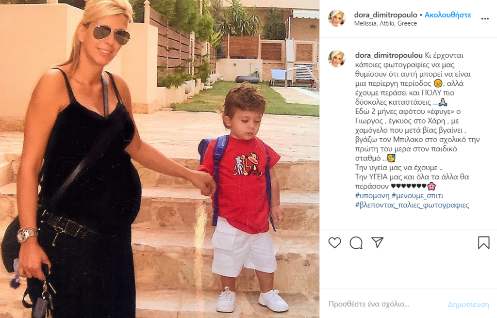 «Κι έρχονται κάποιες φωτογραφίες να μας θυμίσουν ότι αυτή μπορεί να είναι μια περίεργη περίοδος , αλλά έχουμε περάσει και ΠΟΛΥ πιο δύσκολες καταστάσεις … Εδώ 2 μήνες αφότου «έφυγε» ο Γιώργος , έγκυος στο Χάρη , με χαμόγελο που μετά βίας βγαίνει , βγάζω τον Μπιλάκο στο σχολικό την πρώτη του μέρα στον παιδικό σταθμό .. Την υγεία μας να έχουμε .. Την ΥΓΕΙΑ μας και όλα τα άλλα θα περάσουν ♥️♥️♥️♥️♥️♥️♥️ » έγραψε στη λεζάντα της φωτογραφίας.