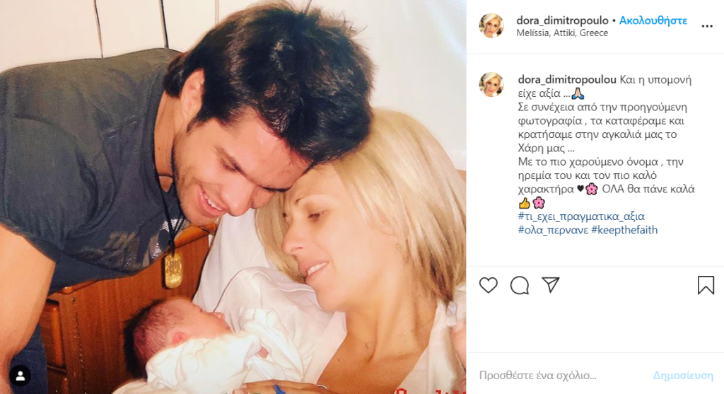 Ενώ αμέσως μετά δημοσίευσε μια φωτογραφία από τη μέρα που γεννήθηκε ο γιος της γράφοντας, «Και η υπομονή είχε αξία …Σε συνέχεια από την προηγούμενη φωτογραφία , τα καταφέραμε και κρατήσαμε στην αγκαλιά μας το Χάρη μας …Με το πιο χαρούμενο όνομα , την ηρεμία του και τον πιο καλό χαρακτήρα ♥️ ΟΛΑ θα πάνε καλά».