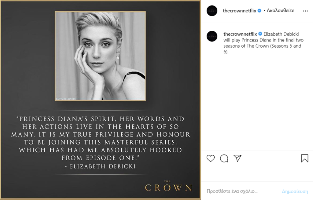 H Emma Corrin θα υποδυθεί την πριγκίπισσα Diana στην 4η σεζόν και η Elizabeth Debicki στην 5η και 6η σεζόν.