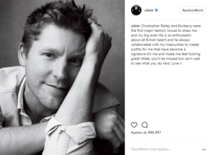 Με έναν μοναδικό τρόπο ευχαρίστησε η Adele τον Burberry για τη συνεργασία τους. Συγκεκριμένα έστειλε το δικό της μήνυμα στον Christopher Bailey που αποχωρεί από τον οίκο μετά από 17 χρόνια.