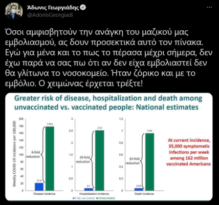 Ενώ σε πρόσφατο tweet του ο Άδωνις Γεωργιάδης αποκάλυψε πως περνάει τον κορονοϊό με έντονα συμπτώματα, παρά τον εμβολιασμό και τόνισε πως αν δεν είχε κάνει το εμβόλιο δεν θα γλίτωνε το νοσοκομείο.