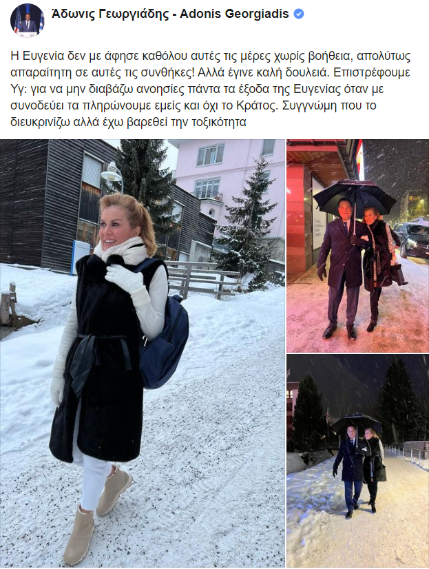 Υγ: για να μην διαβάζω ανοησίες πάντα τα έξοδα της Ευγενίας όταν με συνοδεύει τα πληρώνουμε εμείς και όχι το Κράτος. Συγγνώμη που το διευκρινίζω αλλά έχω βαρεθεί την τοξικότητα» έγραψε ο Άδωνις Γεωργιάδης.