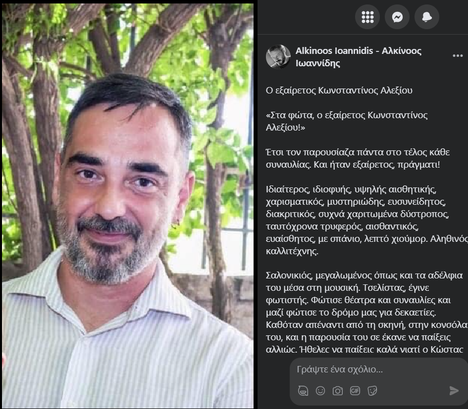 Υπέγραψε και βγήκε από το νοσοκομείο Ιωαννίνων για να προλάβει να στήσει φώτα σε μια παραγωγή που είχε αναλάβει. Έτσι έζησε και έτσι έφυγε. Κηδεύεται σήμερα στη Θεσσαλονίκη. Χωρίς εμάς. Βρισκόμαστε όλοι στην Κύπρο για συναυλίες. Αυτή είναι η πραγματικότητα των μουσικών, των ηχοληπτών, των φωτιστών. Η σκηνή δεν είναι ο χώρος εργασίας μας, αλλά ο χώρος που ζούμε, γιορτάζουμε, πενθούμε, μοιραζόμαστε. Το ταξίδι είναι η απουσία και μαζί η παρουσία μας. Στην ψυχή και στο σώμα μας, στο σπίτι μας, στους δικούς μας, συμβαίνουν πολλά. Κι εμείς τα ακουμπάμε στο σανίδι και στις καρδιές των ανθρώπων. Αυτή είναι η ζωή μας. Αυτή ήταν και η ζωή του Κώστα.