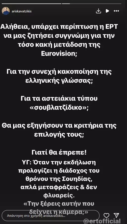 Με αφορμή αυτό, ο Άρης Καβατζίκης ξέσπασε μέσα από το instagram κι αναρωτήθηκε αν η ΕΡΤ θα ζητήσει δημόσια συγγνώμη για την κακή μετάδοση.