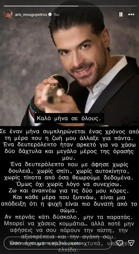 «Καλό μήνα σε όλους. Σε έναν μήνα συμπληρώνεται ένας χρόνος από τη μέρα που η ζωή μου άλλαξε για πάντα. Ένα δευτερόλεπτο ήταν αρκετό για να χάσω δύο δάχτυλα και μεγάλο μέρος της όρασής μου.