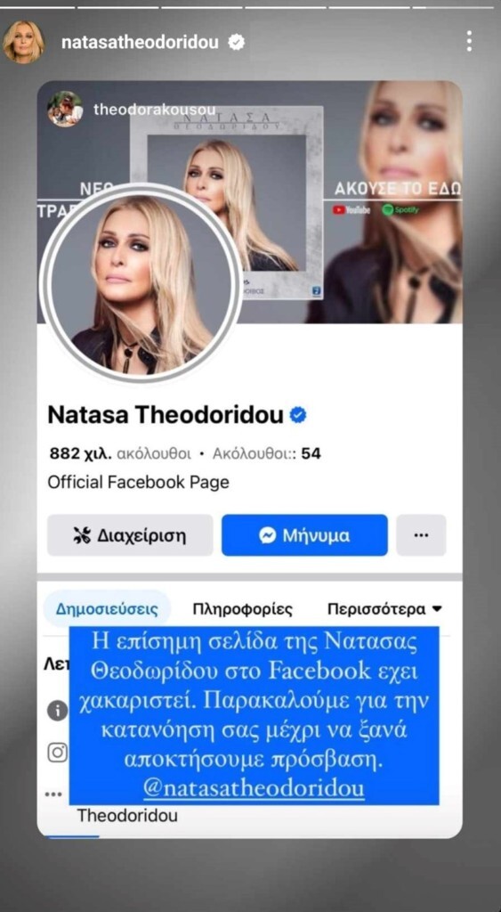 «Η επίσημη σελίδα της Νατάσας Θεοδωρίδου στο Facebook έχει χακαριστεί. Παρακαλούμε για την κατανόησή σας μέχρι να ξαναποκτήσουμε πρόσβαση» ανέφερε η Νατάσα Θεοδωρίδου στην ανάρτηση της.