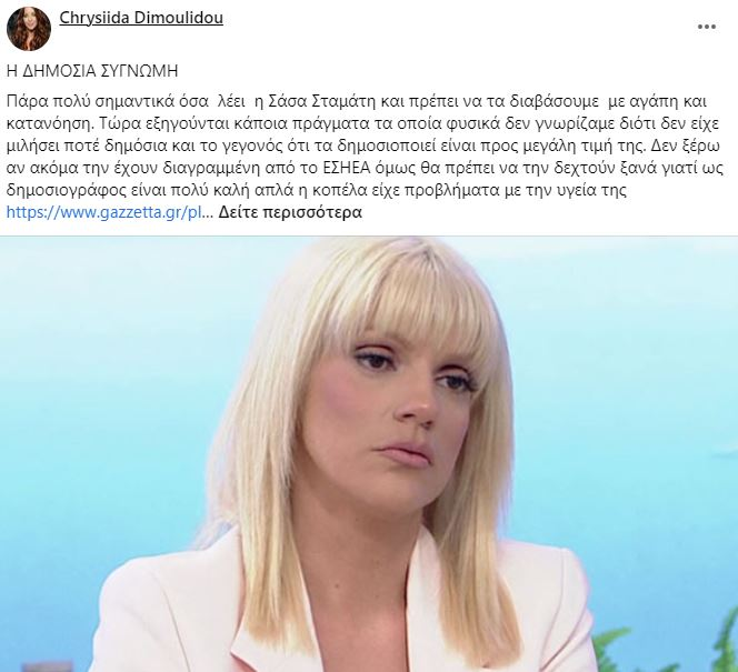 Δεν ξέρω αν ακόμα την έχουν διαγραμμένη από το ΕΣΗΕΑ όμως θα πρέπει να την δεχτούν ξανά γιατί ως δημοσιογράφος είναι πολύ καλή απλά η κοπέλα είχε προβλήματα με την υγεία της» έγραψε η Χρυσηίδα Δημουλίδου στην ανάρτησή της.