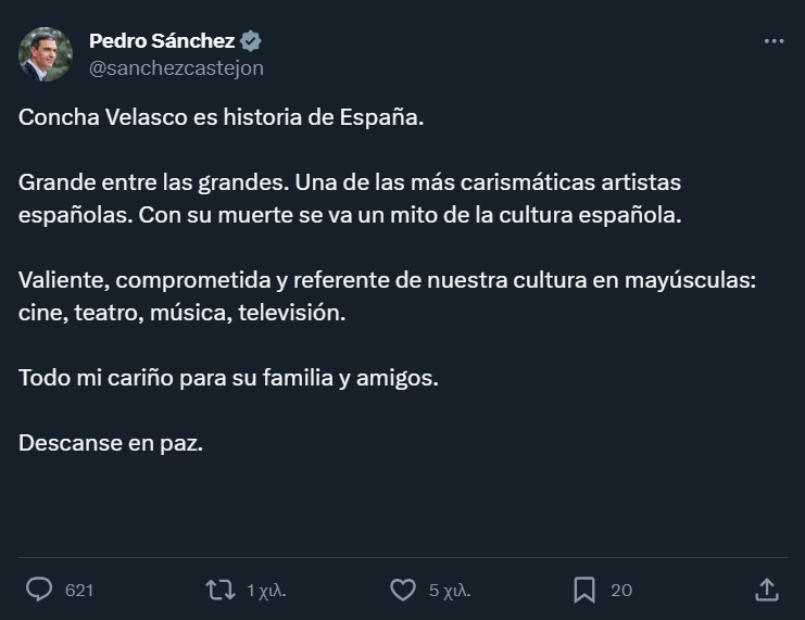 Μεταξύ τους και ο Πρωθυπουργός της Ισπανίας, Pedro Sánchez που επαίνεσε τη φιγούρα της ως μία από τις πιο «χαρισματικές» Ισπανούς καλλιτέχνες, γράφοντας στο «X»: