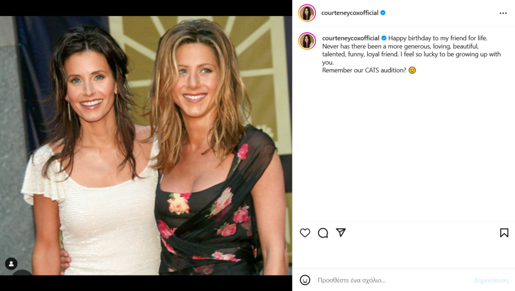 Μάλιστα, με αφορμή τα γενέθλια της Aniston που φέτος έκλεισε τα 56 χρόνια ζωής της, η Cox θέλησε να της ευχηθεί και με μία ανάρτηση στα social media.