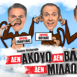 Το «Δεν ακούω, δε βλέπω, δε μιλάω» εμπνευσμένο από έναν παλιό Ινδικό μύθο για την υπομονή και την μακροθυμία απέναντι στις δυσκολίες της ζωής, είναι μια πολύ ιδιαίτερη, ξεκαρδιστική κωμωδία. Ταυτόχρονα, όμως, είναι ένα έργο για τη συντροφικότητα, την αγάπη, την εκτίμηση, τη φιλία, τον καθημερινό αγώνα και την αισιόδοξη προσέγγιση της ζωής, σε μια εποχή που οι μαύρες σκέψεις πληθαίνουν.