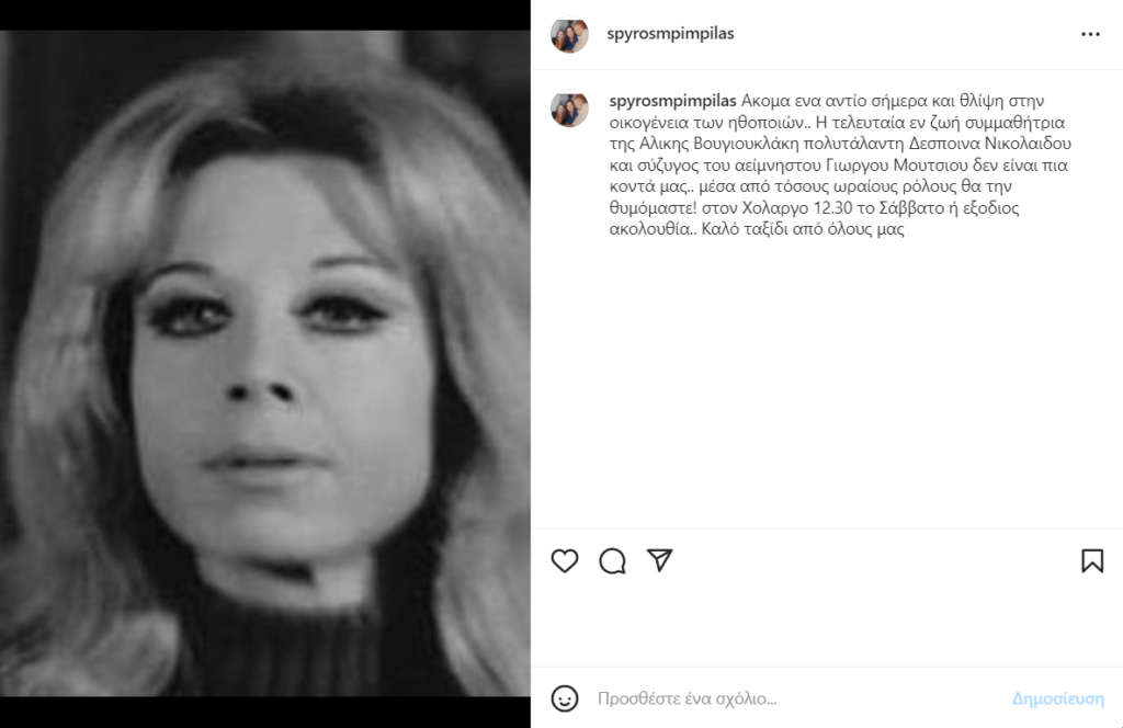 «Ακόμα ένα αντίο σήμερα και θλίψη στην οικογένεια των ηθοποιών.. Η τελευταία εν ζωή συμμαθήτρια της Αλικης Βουγιουκλάκη πολυτάλαντη Δέσποινα Νικολαΐδου και σύζυγος του αείμνηστου Γιώργου Μούτσιου δεν είναι πια κοντά μας.. μέσα από τόσους ωραίους ρόλους θα την θυμόμαστε! στον Χολαργο 12.30 το Σάββατο ή εξοδιος ακολουθία.. Καλό ταξίδι από όλους μας» έγραψε ο Σπύρος Μπιμπίλας στην ανάρτησή του.