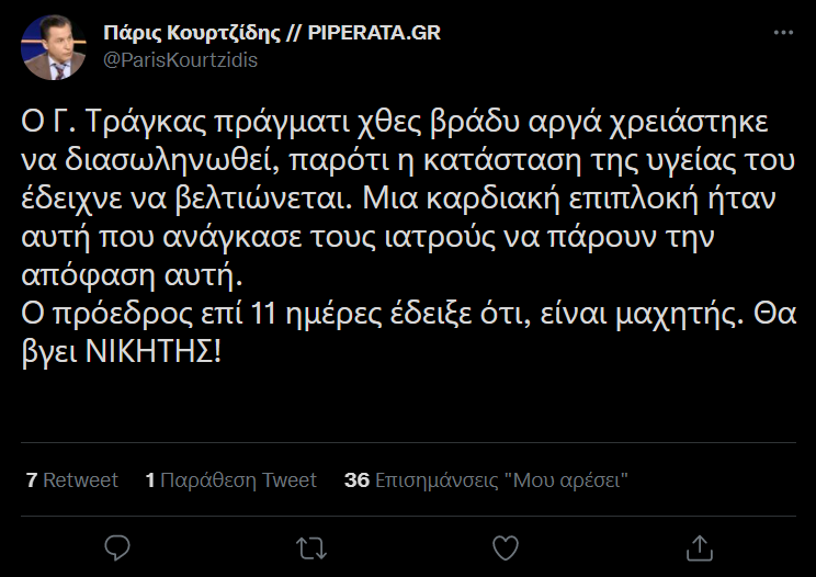 «ο Γ. Τράγκας πράγματι χθες βράδυ αργά χρειάστηκε να διασωληνωθεί, παρότι η κατάσταση της υγείας του έδειχνε να βελτιώνεται. Μια καρδιακή επιπλοκή ήταν αυτή που ανάγκασε τους ιατρούς να πάρουν την απόφαση αυτή. Ο πρόεδρος επί 11 ημέρες έδειξε ότι, είναι μαχητής. Θα βγει ΝΙΚΗΤΗΣ!».