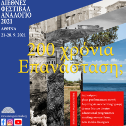 Το Διεθνές Φεστιβάλ Αναλόγιο, στο πλαίσιο της επετείου των 200 χρόνων από την Επανάσταση του 1821, διοργάνωσε παγκόσμιo διαγωνισμό συγγραφής θεατρικών έργων μικρής φόρμας με τίτλο “200 χρόνια Επανάσταση; Ξαναγράφοντας τους αρχαίους μύθους σήμερα”. Συνολικά κατατέθηκαν εκατόν ογδόντα έργα από δώδεκα χώρες: Ελλάδα, Βολιβία, Γερμανία, Δημοκρατία της Βόρειας Μακεδονίας, Ελβετία, Η.Π.Α., Ινδία, Ιράν Μεξικό, Μογγολία, Σλοβενία, Τσεχία.